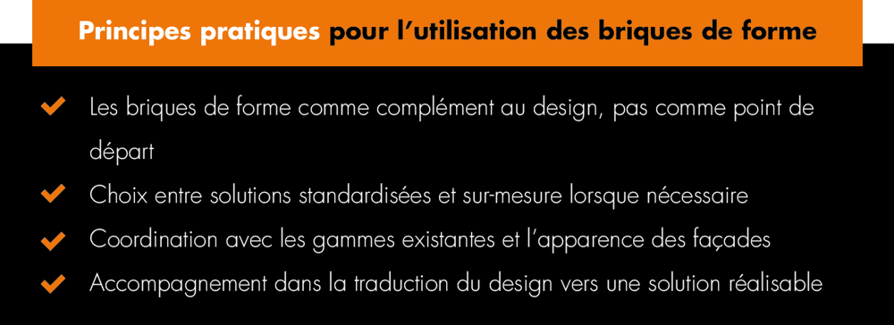 Les briques spéciales interviennent à différentes phases du processus de construction. En les intégrant suffisamment tôt dans la conception, une meilleure clarté est obtenue concernant les détails, les raccords et les dimensions.